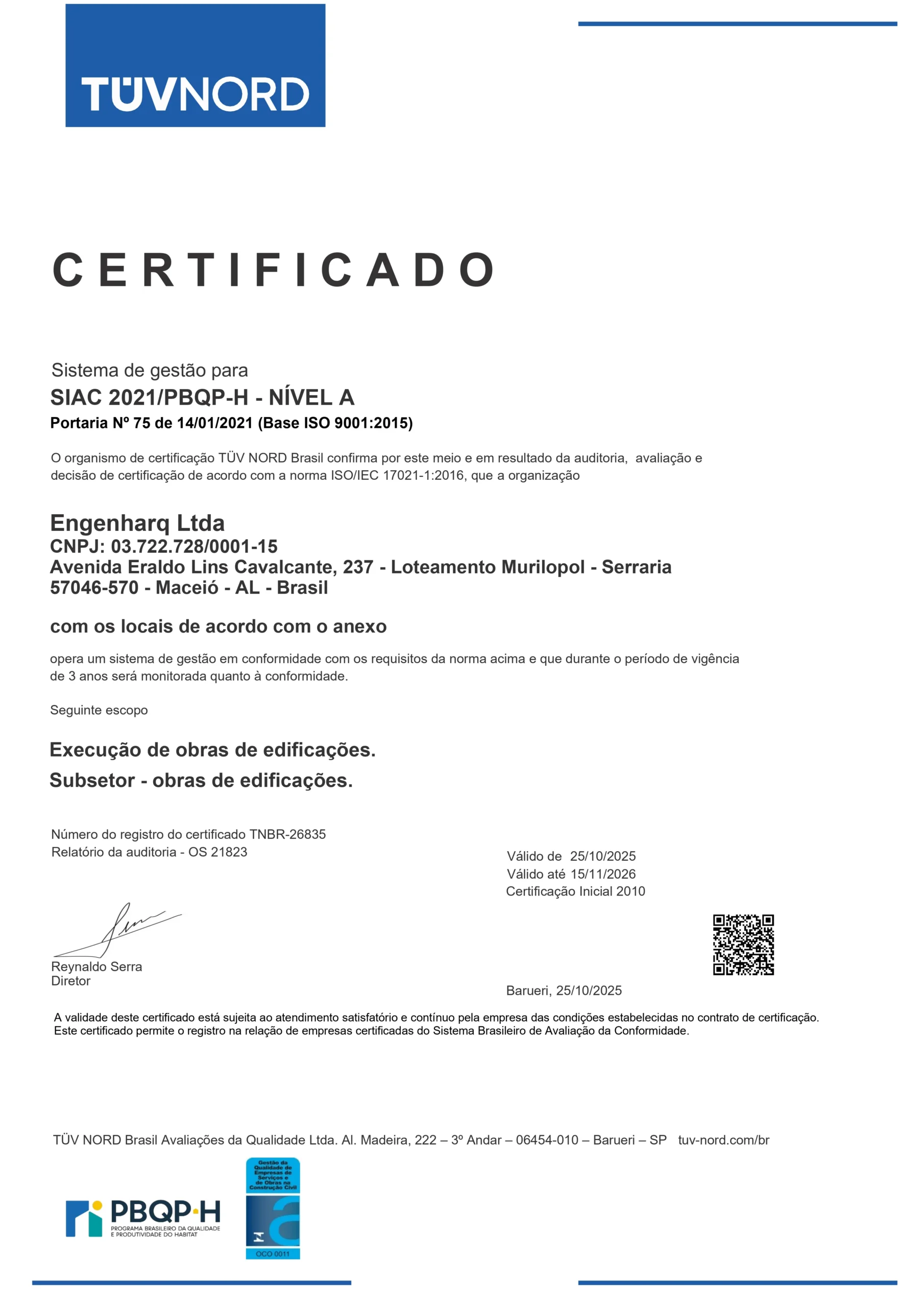 Além disso, a Engenharq LTDA, é certificada na ISO 9001 não escopo de obras de edificações. Ambas as Certificações são atestadas pelo Organismo de Acreditação TÜV NORD BRASIL.